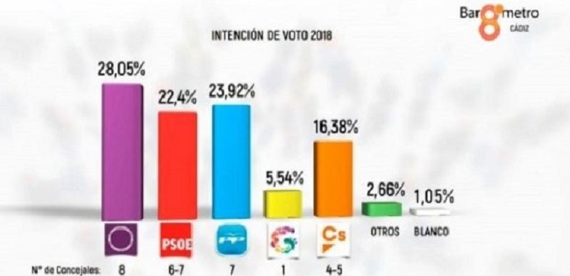Respecto a la intención de voto, en el año 2018, Podemos (Por Cádiz Sí Se Puede) con José María González ganaría las elecciones obteniendo 8 concejales con un 28,05% de los votos, seguido del Partido Popular que lidera en la capital Juancho Ortiz, que alcanzaría los 7 concejales con el 23,92% de los votos.