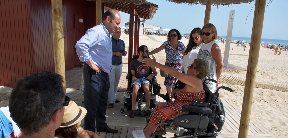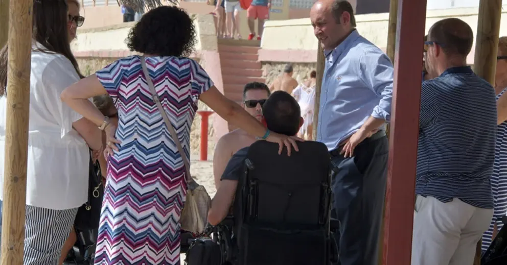 El concejal del GMPP (Grupo Municipal del Partido Popular) y candidato a la Alcaldía, Juancho Ortiz, ha compartido unos minutos con los usuarios del módulo de playas que –al menos hasta 2015- era uno de los tres que estaban completamente adaptados al uso para personas con discapacidad. Ortiz ha podido comprobar, tal y como había denunciado AGADI, que ese módulo –conocido como el del Drago- se mantiene, a 17 de julio, completamente cerrado y sin que se esté prestando el servicio de asistencia al baño para las personas con discapacidad que frecuentan a diario esta zona de playa.