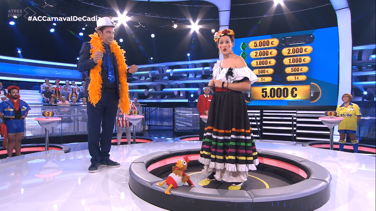 Arranca el programa, antes inclusive de la conexión con el plató, proyectándose imágenes del Carnaval a pie de calle. Colorido y tributo visual. Ilustración musical de ‘Aquellos duros antiguos’ del Tío de la Tiza. Pili, la concursante, como la práctica totalidad de sus oponentes, vienen de Cádiz. No podía ser de otro modo. Disfraces por doquier. Arturo Valls evidencia que ha hincado los codos sobre el carnaval gaditano: no cesa de aportar, fluidamente, datos.
