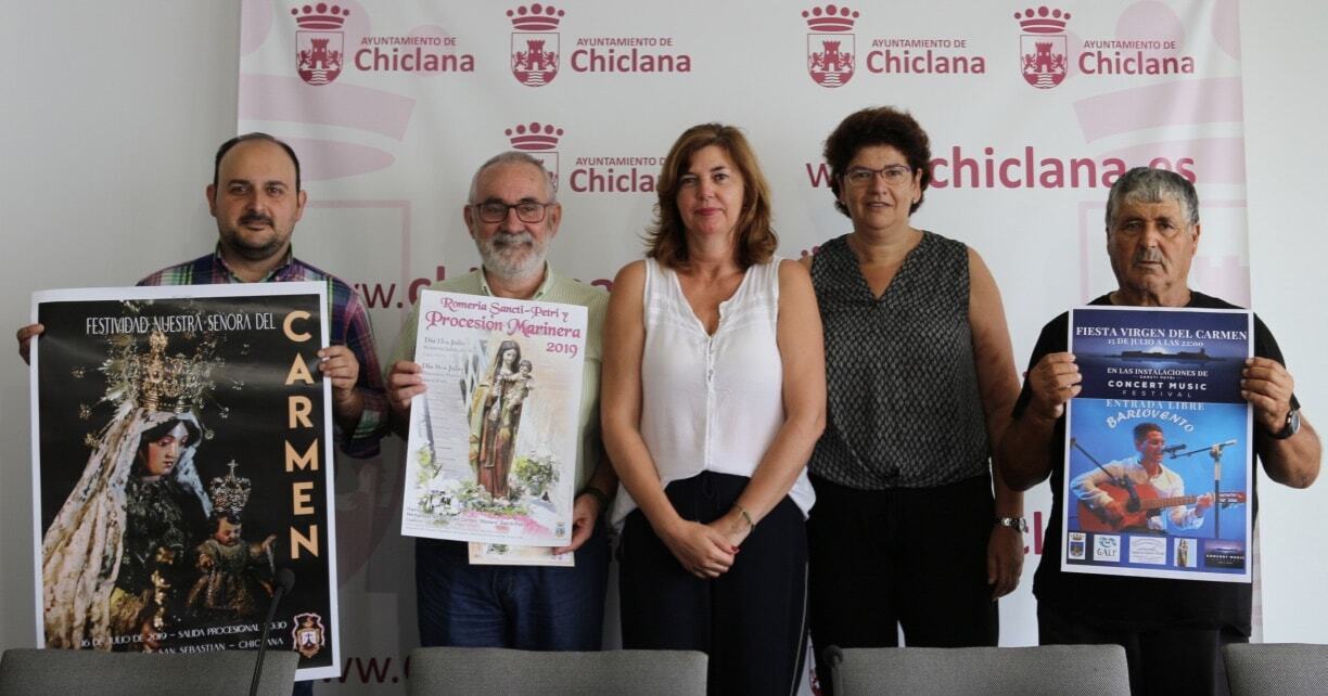La delegada municipal de Cultura, Pepa Vela; el representante de la Hermandad Nuestra Señora del Carmen Atunera, José María Román; el hermano mayor de la Hermandad Nuestra Señora del Carmen de Chiclana, Carlos González, y el representante de la Asociación de Pescadores Mar de Sancti Petri, Manuel Vela, han presentado los actos que se celebrarán para conmemorar la festividad de la Virgen del Carmen, que se celebra el próximo 16 de julio, tanto en el poblado de Sancti Petri como en el centro de la ciudad.