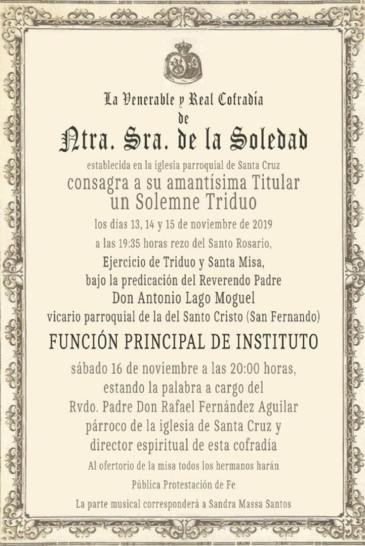 La Cofradía de la Soledad y Santo Entierro celebra en la iglesia parroquial de Santa Cruz solemne triduo en honor a su titular, Nuestra Señora de la Soledad en el transcurso de los próximos días.