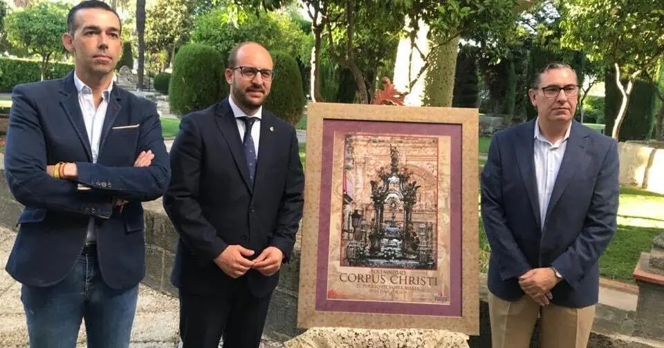 El Hotel Duques de Medinaceli acogió ayer la presentación del cartel oficial de la Festividad del Corpus Christi, a la que asistió el alcalde de El Puerto, Germán Beardo, junto con el próximo delegado de la Concejalía de Fiestas, David Calleja.