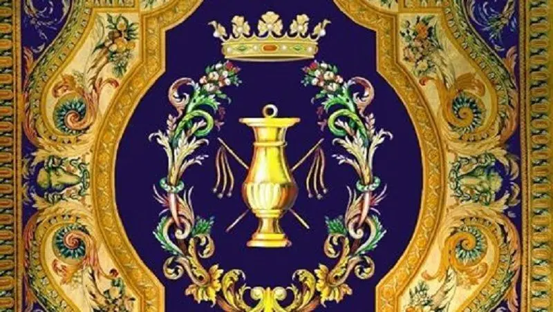 En el centro se ha colocado un dibujo que se ha elaborado solo para este trabajo inspirado en el primer escudo de la archicofradía, del que se conservan varios ejemplos en la casa de hermandad.