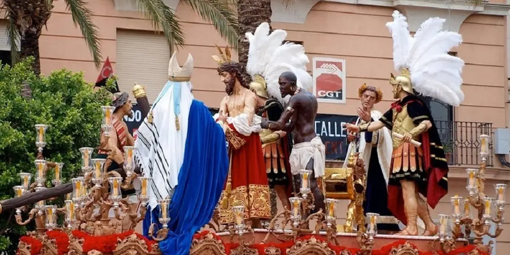 Aparte, para darle sentido a la representación iconográfica de los textos evangélicos, se situará por detrás del Señor en el lado izquierdo el romano que porta el pergamino de la sentencia, el cual señala el camino que debe emprender el Señor con la Cruz, en el lado derecho, escoltando al Señor, se situará el otro romano, que es quien lo lleva prendido.