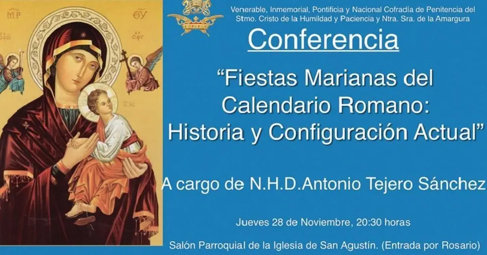 En este sentido, este próximo jueves 28 de noviembre, a las ocho y media de la tarde, la Hermandad del Santísimo Cristo de la Humildad y Paciencia y Nuestra Señora de la Amargura, dentro de su plan de formación, tiene previsto ofrecer la conferencia que llevará por título 'Las Fiestas Marianas del Calendario Romano: Historia y Configuración Actual'.