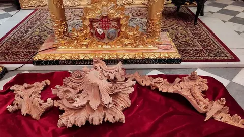 A lo largo del mismo, se pudo comprobar el tallado completado del nuevo paso y, además, el frontal dorado con la primera de las cartelas, la frontal que estará conformada por la Santa Cruz de Jerusalén flanqueada por dos ángeles.