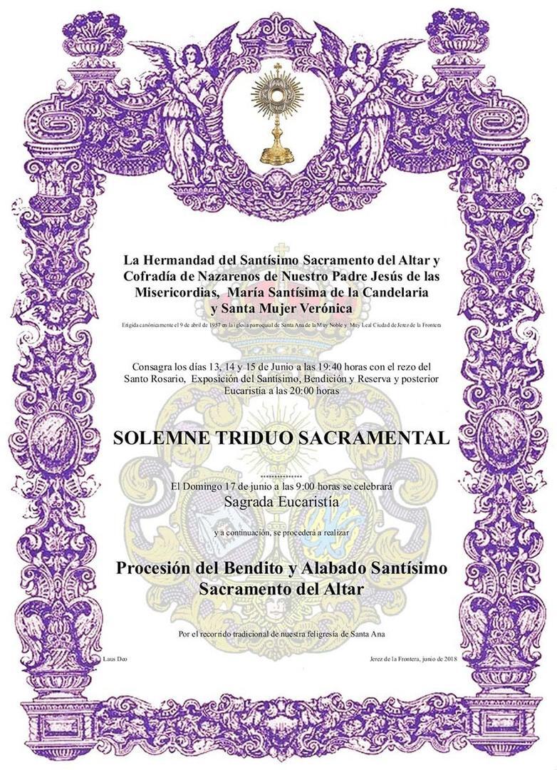 La Hermandad Sacramental de la Candelaria celebrará un Triduo en Honor del Santísimo Sacramento del Altar los días 13, 14 y 15 junio.