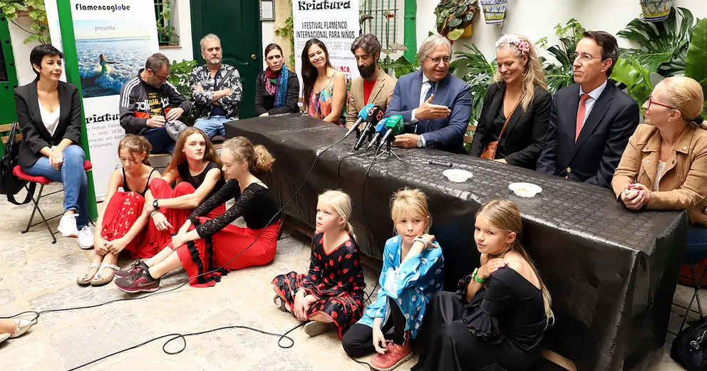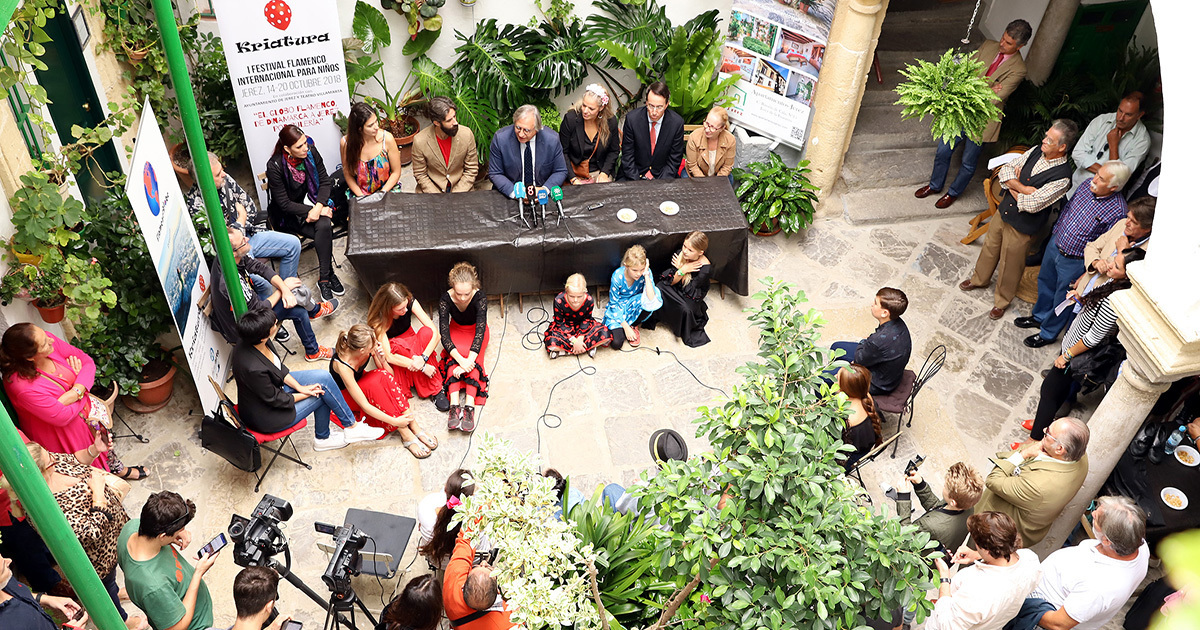 El teniente de alcaldesa de Urbanismo, Dinamización Cultural, Patrimonio y Seguridad, Francisco Camas, junto a Kristine Hastrup, el presidente de González Byass y vicecónsul de Dinamarca, Mauricio González Gordon, Pedro Garrido ‘Niño de la Fragua’, Chiqui de Jerez y numerosos artistas flamencos de la ciudad, ha inaugurado en el patio de los Apartamentos de Jerez, en el barrio de San Miguel, el I Festival Internacional de Flamenco para niños ‘Kriatura’, que se celebra en la ciudad hasta el próximo sábado, 20 de octubre.