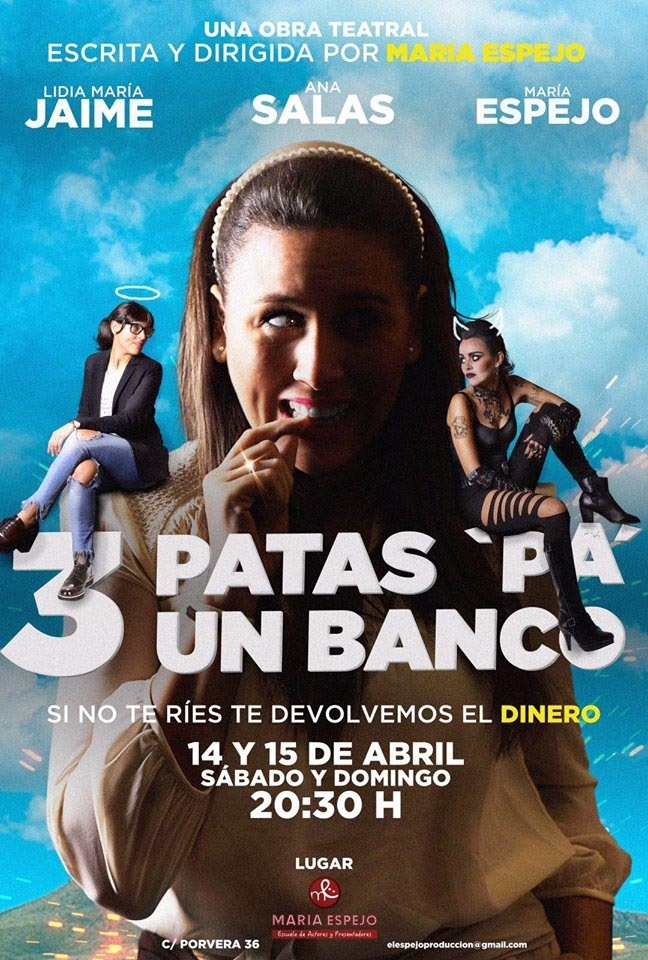 En palabras de su escritora y directora, María Espejo, ""3 patas 'pa' un banco" es una comedia que cuenta la historia de tres amigas, Lía, Tía y Mía. Tres mujeres, tres estereotipos, con el objetivo de romper los moldes que hasta ahora nos ha marcado la sociedad. Cada ser humano es único, nada es lo que parece y el sentido de esta obra es claro: reír y reír sin parar. Hay que ir al teatro. Si se va a pasarlo bien mucho mejor, no queremos más drama, sólo comedia. Tan claro lo tengo que si no te ríes te devuelvo el dinero".