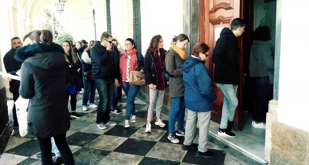 Colas en la entrada del Ayuntamiento para recoger las invitaciones para el acto de entrega del artista como Hijo de Adoptivo de Cádiz previsto para este sábado en el Palacio de Congresos
