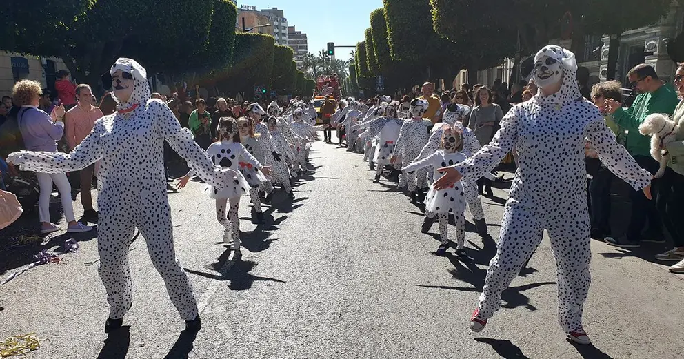 “Qué bonita está Almería, qué bonita es mi ciudad, qué rebosa de alegría, cuando llega el Carnaval”. El cántico, escuchado en varias ocasiones a lo largo del trayecto del desfile, se resume la explosión de color y alegría que ha tomado este mediodía las calles del centro, desde el final del Paseo hasta el Anfiteatro de la Rambla, recorriendo también la rambla Obispo Orberá y la Avenida Federico García Lorca.