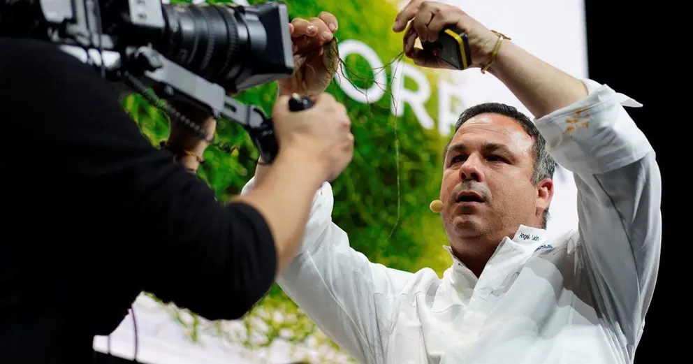 “Si te invaden, cómetelo” era el título de la presentación del chef de Aponiente y Alevante en la que ha reivindicado la riqueza gastronómica de dos espacios a menudo olvidados por el mundo de la cocina: la marisma salinera, y en concreto a la gusana de mar. En España se usa como cebo de pesca pero "cuesta 650 euros en Japón" y "se cocina y es muy apreciada en otras partes del mundo por su sabor, entre una espardeña y una navaja". Éste es solo uno de los ingredientes que ha propuesto Ángel León, además de una miel extraída de la ruppia marítima, la papada marina de barriga de lisa ahumada, morcilla de caballa con tinta negra, chorizo ahumado de caballa, patata de mar y un alga invasora de la zona, chaetomorpha que conforman su propuesta de “cocido madrileño de la marisma”. La conferencia ha estado precedida y clausurada por dos anuncios de Cádiz como destino turístico.