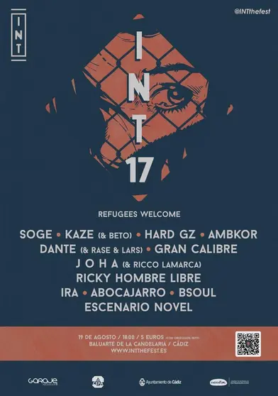 INT17 seguirá siendo uno de los festivales de rap referentes del rap nacional e internacional. En el escenario del Baluarte de la Candelaria de la capital gaditana, el 19 de agosto, un cartel de artistas relevantes de rap, aportarán su talento y arte con el objetivo de ampliar el mensaje en favor de las y los refugiados. Desde Cartagena Soge y Kaze&Beto; los gallegos Hard GZ y Ricky Hombre Libre; el barcelonés Ambkor; Ira, Dante y Bsoul desde Madrid; los salmantinos Gran Calibre; Joha&Ricco Lamarca dominicana afincada entre Úbeda y Granada y los jerezanos Abocajarro.