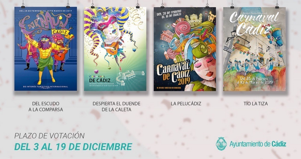 El plazo de la votación popular para la elección del cartel que promocionará el Carnaval de Cádiz 2019 finaliza este miércoles, 19 de diciembre. Como ocurre desde que se abriera el plazo el pasado día 3, aún tienen unas horas para seguir votando todos los gaditanos y gaditanas empadronadas en la ciudad, en posesión de DNI y con correo electrónico a través de la URL habilitada al efecto (http://ocadizdigital.es/conurso-cartel-carnaval-2019), o bien en los ordenadores ubicados en el vestíbulo del Centro Integral de la Mujer, donde permanecen expuestas todas las obras presentadas al concurso, no sólo las cuatro seleccionadas por el jurado para entrar en esta fase de votación popular.
