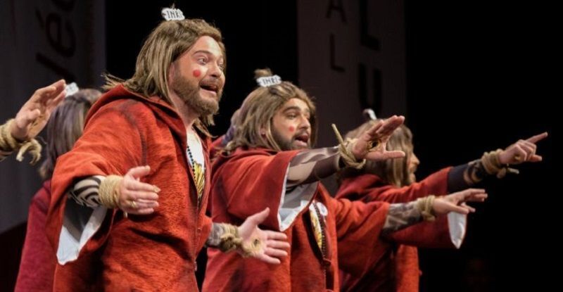 Comentario: Turno en la fase de clasificatorias del Concurso de Agrupaciones, para la chirigota que llega desde Málaga, Ojú por dios. Se presentan como el mismo dios, que vuelve a la tierra, pero en plan moderno, con sus pantalones de pitillo. Lo de la crucifixión no es nada comparado con el frio que pasan ellos por los tobillos.