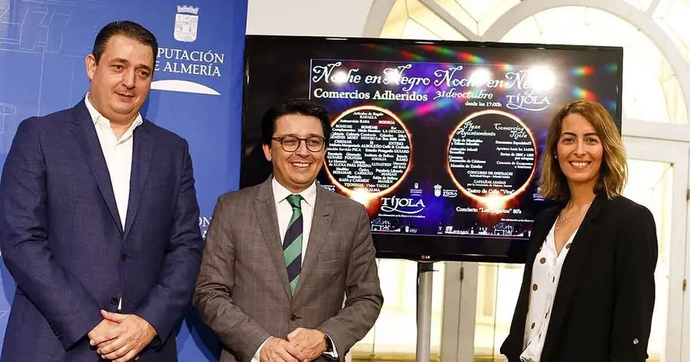 La Noche en Negro de Tíjola se ha presentado en el Palacio Provincial con la participación del diputado de Cultura y Cine, Manuel Guzmán; el alcalde de Tíjola, José Juan Martínez y la concejal de Comercio de Tíjola, María Isabel Tapia.