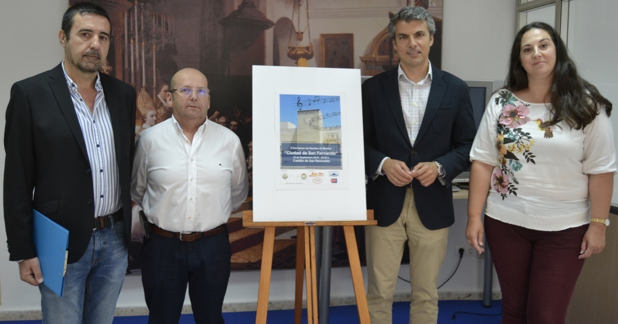 El primer teniente de alcaldesa y delegado general del Área de Promoción de la Ciudad, Fran Romero; la delegada específica de Museos, Begoña Castro; el presidente de la Sociedad Filarmónica de San Fernando, José María García, y el tesorero de la misma, Fernando Gilo, han presentado hoy la segunda edición del Certamen de Bandas de Música Ciudad de San Fernando, que se celebrará en el patio del castillo de San Romualdo el próximo 22 de septiembre. La participación de este evento estará limitada a un máximo de cuatro cuatro bandas, mientras que la Banda Sinfónica de la Sociedad Filarmónica actuará como anfitriona del certamen y fuera de concurso.