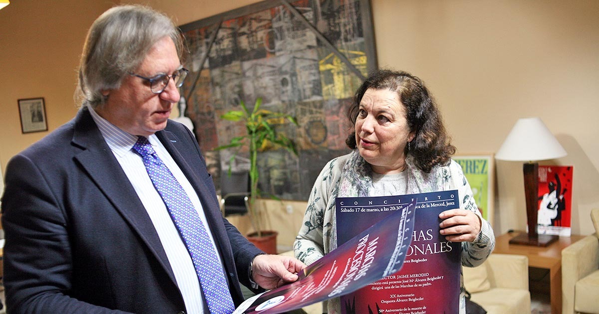 El teniente de alcaldesa de Urbanismo, Dinamización Cultural, Patrimonio y Seguridad, Francisco Camas, acompañado de la presidenta de la asociación de la Orquesta Álvarez Beigbeder, Magdalena Garrido, han presentado el cartel del concierto de marchas procesionales que se celebrará el próximo sábado, 17 de marzo, en la Basílica de La Merced en conmemoración del 50 aniversario del fallecimiento del maestro Germán Álvarez Beigbeder.
