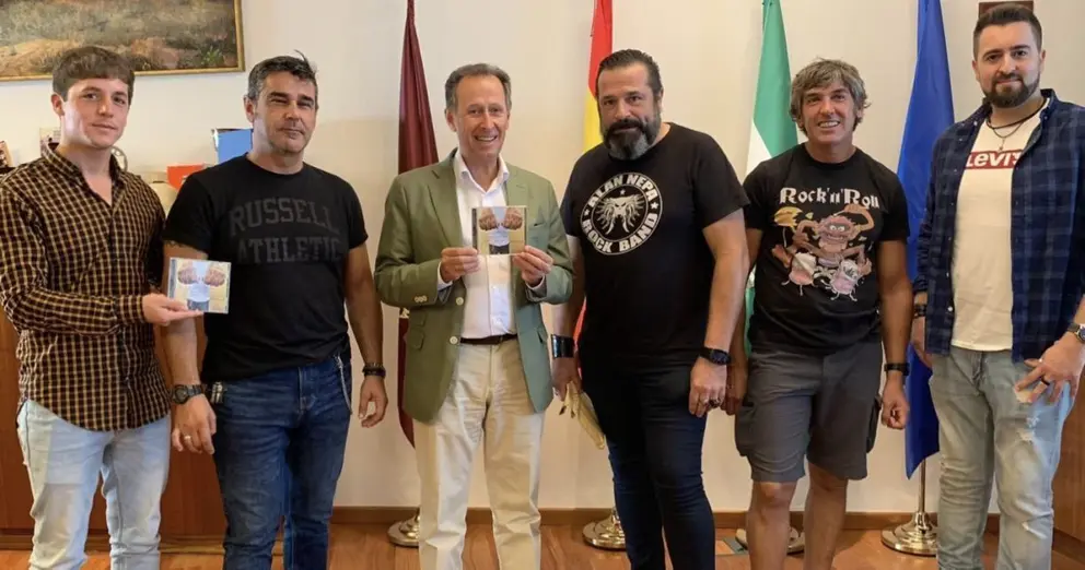 El alcalde de Chiclana, José María Román, y el vocal de Alan Nepa Rock Band, Alfredo Ruiz Frechilla, han presentado el nuevo disco de la banda de rock chiclanera ‘Tatuando mi destino’. Un acto que se ha desarrollado en Alcaldía y que también ha contado con la presencia del delegado municipal de Juventud, José Alberto Cruz, así como con algunos componentes más del grupo.