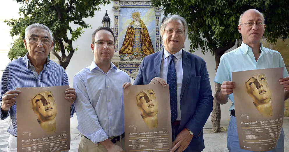El teniente de alcaldesa de Urbanismo, Dinamización Cultural, Patrimonio y Seguridad, Francisco Camas, junto a miembros de la junta directiva de la Hermandad del Mayor Dolor, han presentado hoy el cartel del ciclo de conferencias que se desarrollarán durante el próximo mes de octubre dedicado a la figura del escultor Ignacio López y su época (1658-1718). El ciclo se realiza dentro del marco de los Jueves Culturales de la Hermandad del Mayor Dolor, con la colaboración también de las Hermandades de La Piedad, El Desconsuelo y El Nazareno.