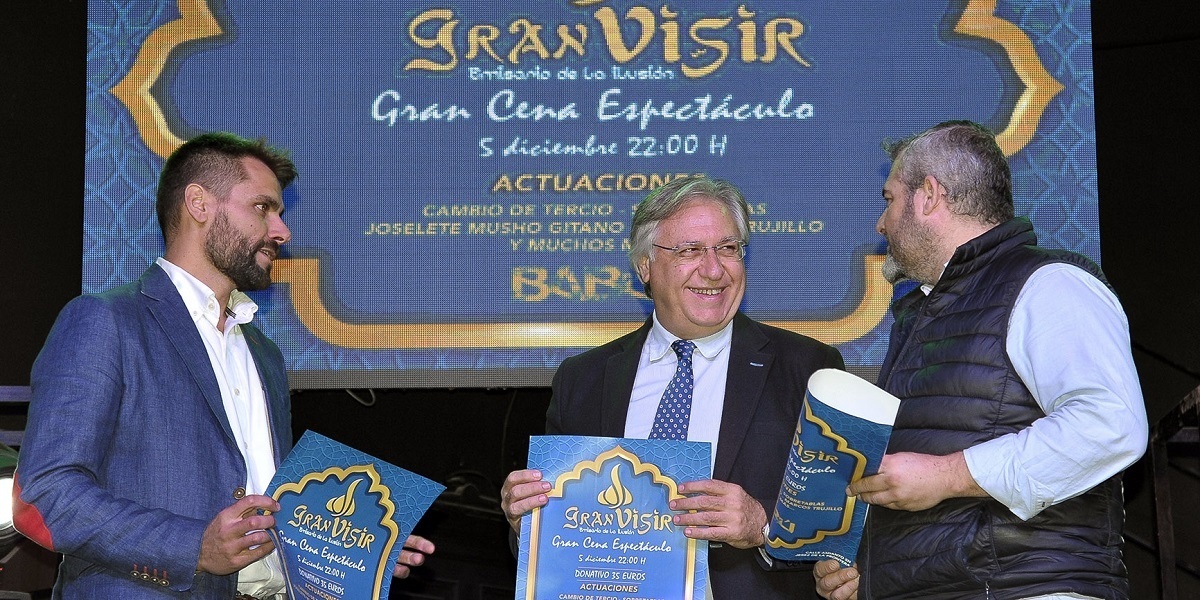 El teniente de alcaldesa de Urbanismo, Dinamización Cultural, Patrimonio y Seguridad, Francisco Camas, acompañado por el Gran Visir, Rafael Mateos, y el gerente de la Sala Babú, Rafael Candón, ha presentado hoy la gran cena espectáculo benéfica que ha organizado el emisario de la ilusión y que tendrá lugar el miércoles 5 de diciembre.