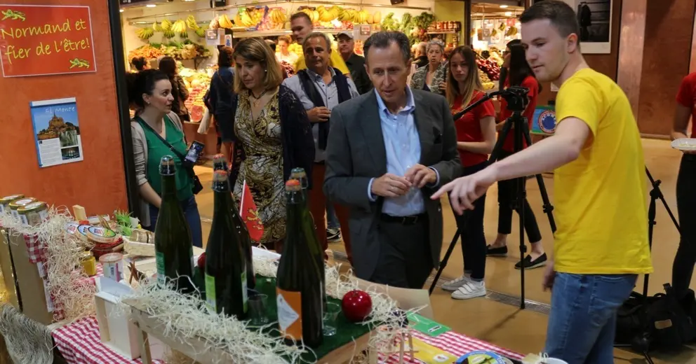 Para ello, estos siete estudiantes de la universidad francesa se encargan de ofrecer en el Mercado de Abastos degustaciones de los productos típicos de la Baja Normandía, entre los que destaca el camembert, originario de esta región gala y que goza de denominación de origen, sidra de manzana, licores calvados, galletas tradicionales de mantequilla, patés de oca, cerdo y pescado.