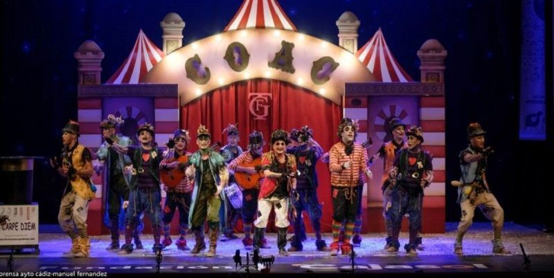 Comentario: Sobre las tablas del Falla, en esta fase de clasificatoria del Concurso Oficial de Agrupaciones del Carnaval de Cádiz, la comparsa gaditana, Los primerizzos. El pasado año concursaron como El pequeño fantasma, pero en la categoría de juveniles. Se presentan baja la carpa de un circo que lleva las letras del COAC en su fachada. “Que se abran las puertas por vez primera y que comience la función”.