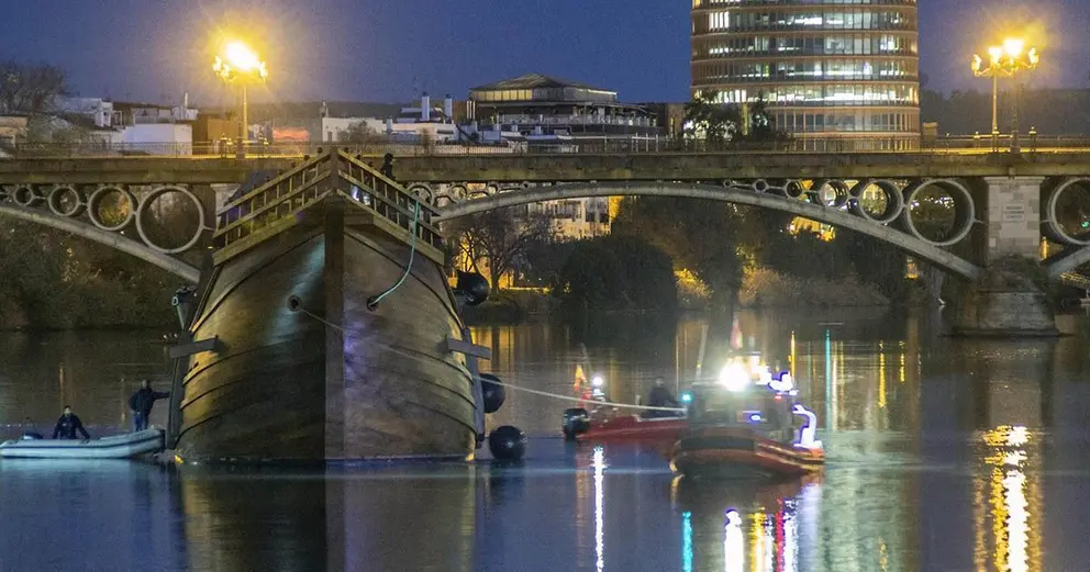 El barco fue botado el 11 de febrero en Punta Umbría (Huelva), tras un año de construcción, en el que han intervenido un equipo de cerca de 60 personas, entre ellos carpinteros de ribera, rederos, veleros, ingenieros y otros oficios. Su casco fue remolcado desde allí hasta Sevilla para dejarlo atracado esta misma madrugada frente al Espacio Primera Vuelta al Mundo, a escasos metros de la Torre del Oro.