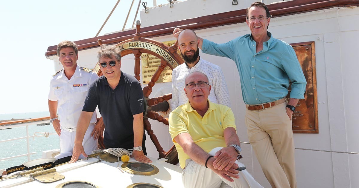 Mauricio González-Gordon, presidente de González Byass; Antonio Flores, enólogo y master vender de González Byas; Joan Roca, chef del Celler de Can Roca (*** Michelin), y Juan Ruiz, jefe de sala y sumiller (Aponiente *** Michelin) -grandes amantes de los vinos de Jerez-, estuvieron presentes en la llegada de este Buque Escuela.