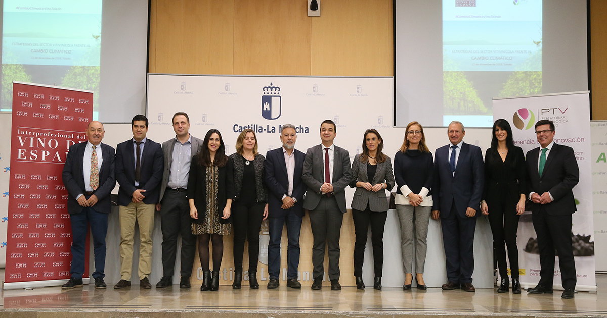 La Organización Interprofesional del Vino de España (OIVE) y la Plataforma Tecnológica del Vino (PTV) celebraron el pasado 11 de diciembre la jornada “Estrategias del sector vitivinícola ante el reto del cambio climático”. El evento, que tuvo lugar en la Escuela de la Administración Regional (Toledo), es fruto del acuerdo entre ambas organizaciones para la dinamización y puesta en marcha de proyectos de I+D+i en el sector vitivinícola, especialmente aquellos relacionados con Sostenibilidad y Cambio Climático.
