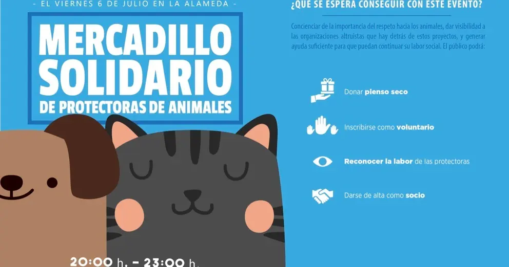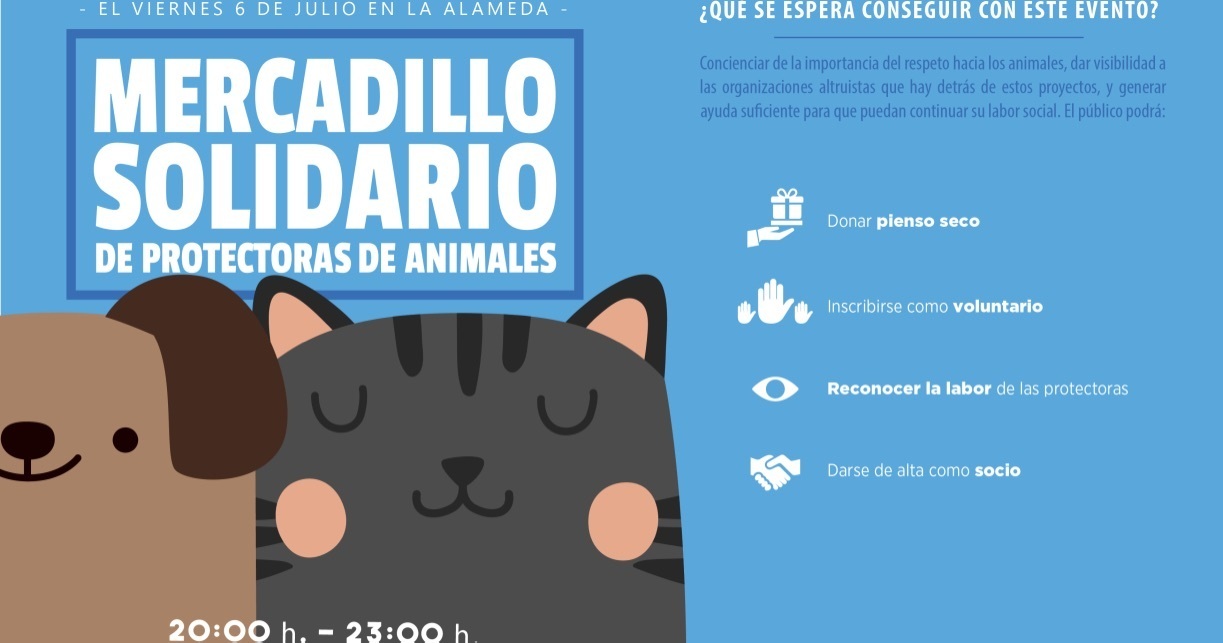 La concejala de Bienestar Animal, Mar Suárez, ha informado de que el próximo viernes, 6 de julio, se celebrará el II Mercadillo Solidario de Protectoras de Animales, que tendrá lugar en la Alameda Moreno de Guerra, de 20,00 a 23,00 horaas. El objetivo de esta iniciativa, la segunda que se celebra este año en colaboración con las protectoras de animales tras la primera edición el pasado 20 de mayo, es el de concienciar a la ciudadanía del respeto hacia los animales.