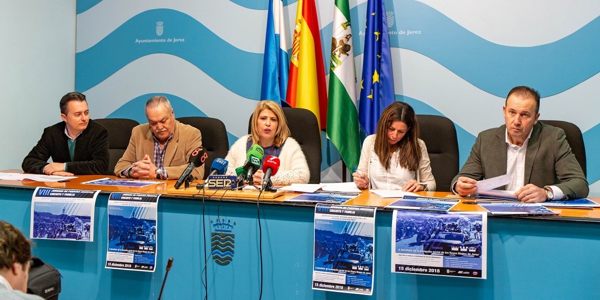 La alcaldesa, Mamen Sánchez y el teniente de alcaldesa de Economía, Hacienda y Planes Especiales y vicepresidente de Cirjesa, Santiago Galván, acompañado de los Reyes Magos 2018, Ana Huguet, Félix Moreno y Francisco Gandón, han presentado esta mañana en el Ayuntamiento, las actividades organizadas con motivo de la VIII Jornada de Puertas Abiertas, que se celebrará en el Circuito de Jerez, el sábado 15 de diciembre, a beneficio de la campaña de Navidad de los Reyes Magos.