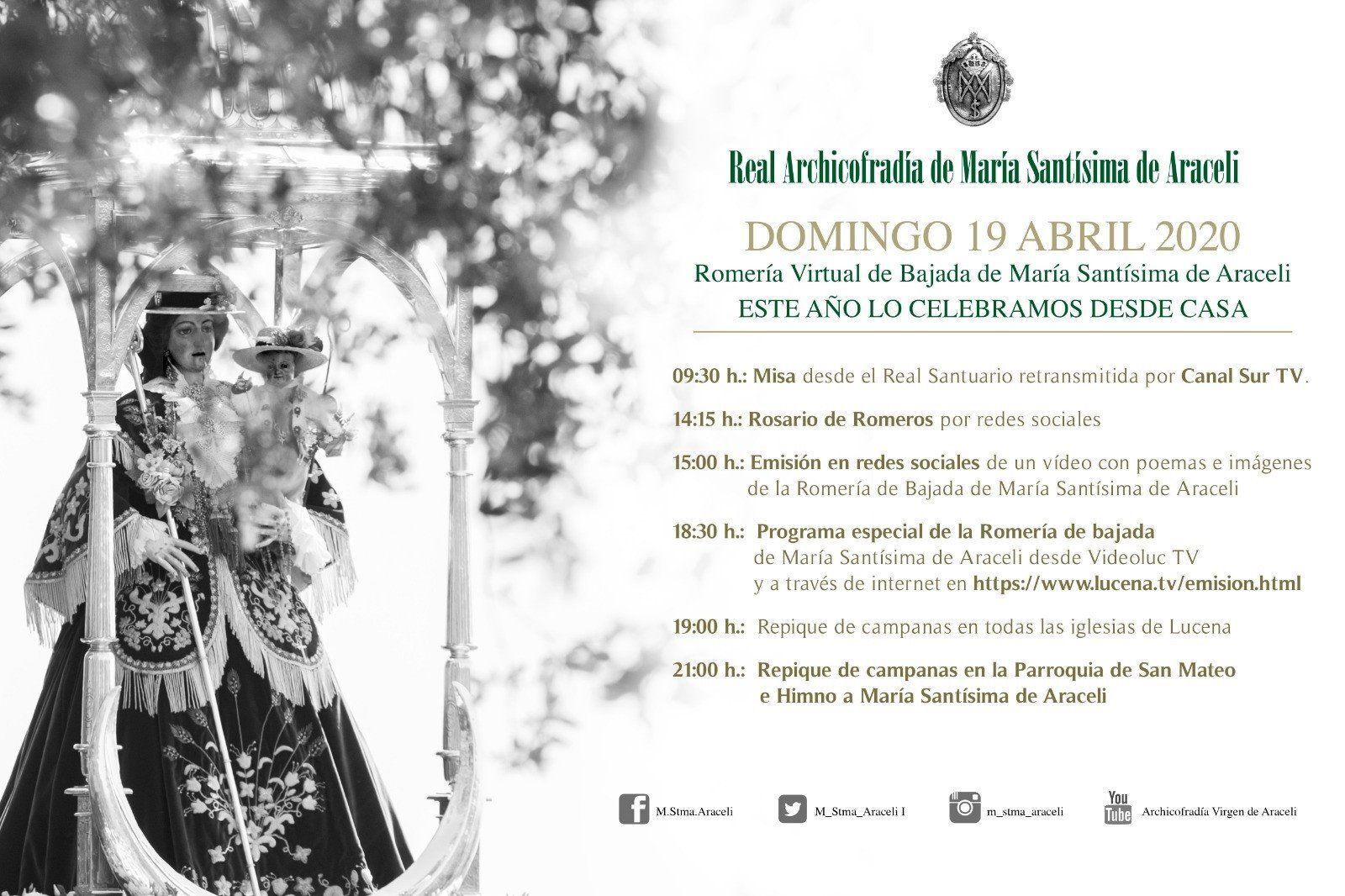 Por último, a las 18,30 horas se emitirá un programa especial de la Romería de Bajada de la Virgen de Araceli por la televisión local Videoluc TV, y también vía Internet, a través de la página web 'https://www.lucena.tv/emision.hlml', acabando la celebración con el repique de campanas en todas las iglesias de Lucena a las 19,00 horas y también a las 21,00 horas en la Parroquia de San Mateo, también con el Himno a María Santísima de Araceli.