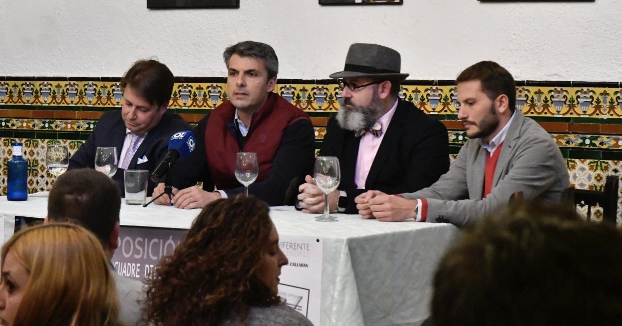 El primer teniente de alcaldesa y delegado general del Área Municipal de Promoción de la Ciudad, Fran Romero; el fotógrafo Miguel Ángel Fernández Cosme (Harry Callahan); el periodista Antonio Campos y el responsable de la plataforma 'Elefante Multicolor', Carlos Salazar, presentaron el pasado sábado en la Venta de Vargas la estancia en dicho espacio de la exposición fotográfica 'Un encuadre diferente, la fotografía cofrade de Harry Callahan' y la campaña de crowfunding que llevará a la edición del libro que recopilará las obras de dicha exposición.