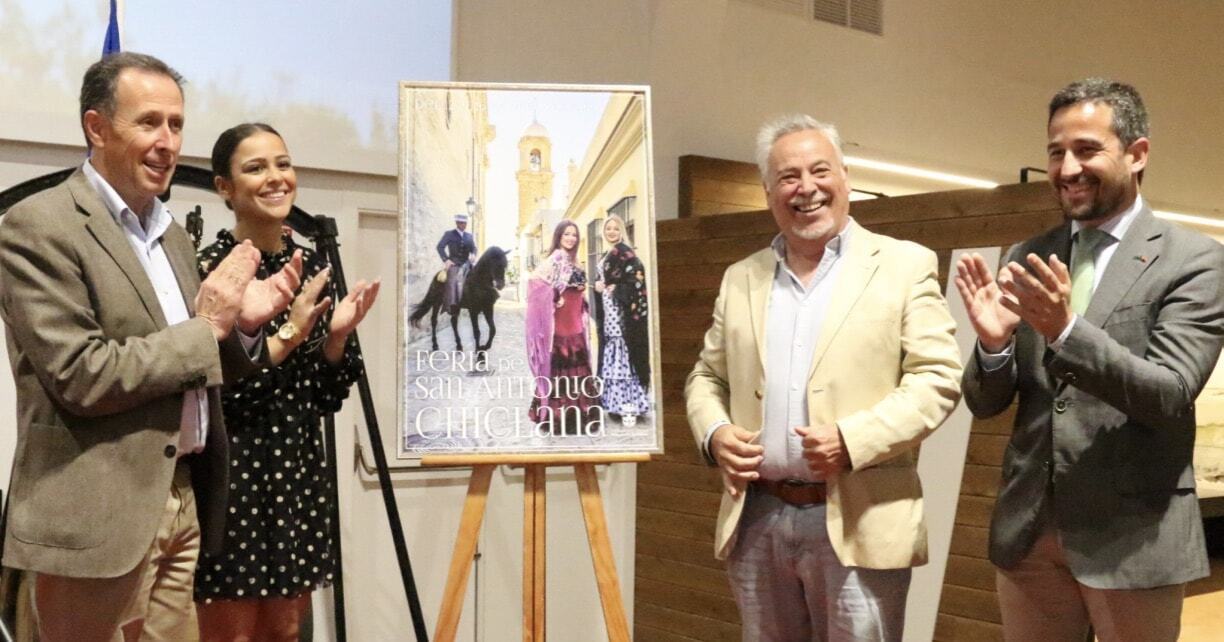 El alcalde de Chiclana, José María Román; el delegado municipal de Fiestas, José Manuel Vera; el autor de la obra, Pedro Leal, y los protagonistas de la imagen, Macarena Ramírez y Pedro Serrano, han presentado el cartel anunciador de la Feria y Fiestas de San Antonio de este año, que se desarrollará entre el 12 y el 16 de junio en el recinto ferial de Las Albinas del Torno. Un acto que se ha desarrollado en el Centro de Interpretación del Vino y la Sal y en el que han estado presentes familiares y amigos de los protagonistas.