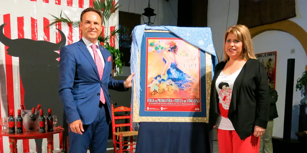 La alcaldesa, Mamen Sánchez, acompañada por el teniente de alcaldesa de Urbanismo, Dinamización Cultural, Patrimonio y Seguridad, Francisco Camas, ha asistido junto al alcalde de El Puerto, David de la Encina, y el director de Comunicación del Grupo Osborne, Iván Llanza, al acto de presentación del cartel de la Feria de Primavera y Fiesta del Vino Fino 2017, obra del pintor portuense, Juan Ariza Bernal, celebrado en la bodega Osborne.
