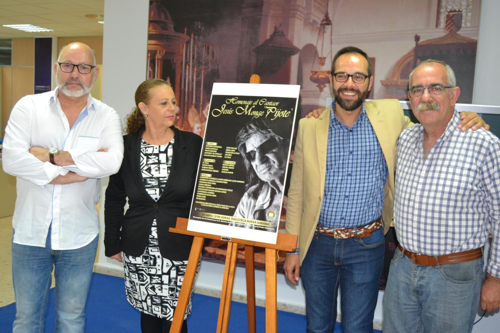 El delegado municipal de Cultura, Juanjo Carrera; la directora de la Academia Cumbre Flamenca, Carmen Peña; Nico Cotoruela, representando a la Peña Trini de La Isla, e Ignacio Escuín, fotógrafo y miembro de la Tertulia Flamencos de La Isla, han presentado esta mañana el homenaje al cantaor Jesús Monje 'Pijote', que tendrá lugar el próximo 29 de abril a partir de las 13.00 horas en la discoteca Nueva Habana. Durante este homenaje, impulsado por la Delegación Municipal de Cultura en colaboración con diversos colectivos isleños vinculados al flamenco, actuarán numeroso artistas.