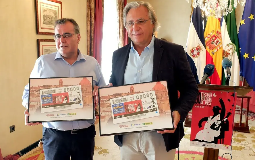 El director de la ONCE en Jerez, Cristino Ortuno, ha presentado hoy la imagen de este cupón al teniente de alcaldesa de Urbanismo, Dinamización Cultural, Patrimonio y Seguridad del Ayuntamiento, Francisco Camas, en un acto celebrado en el Salón Noble del Ayuntamiento.
