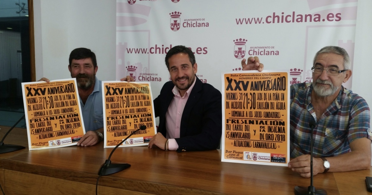 El delegado municipal de Fiestas, José Manuel Vera, ha comparecido ante los medios de comunicación junto al vicepresidente y el secretario de la Peña Carnavalesca Chiclanera Hombres del Campo, Juan Antonio Navarro y Antonio Santandreu respectivamente, para presentar los actos que desde esta Peña han organizado para conmemorar su XXV aniversario.