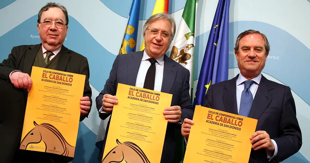 El teniente de alcaldesa de Urbanismo, Dinamización cultural, Patrimonio y Seguridad, Francisco Camas, junto al presidente de la Real Academia de San Dionisio, Joaquín Ortiz, y el vicepresidente de Artes, Juan Salido, ha presentado hoy un ciclo de conferencias sobre el caballo organizado por la Real Academia con motivo de la Capitalidad Ecuestre que celebra Jerez en 2018.