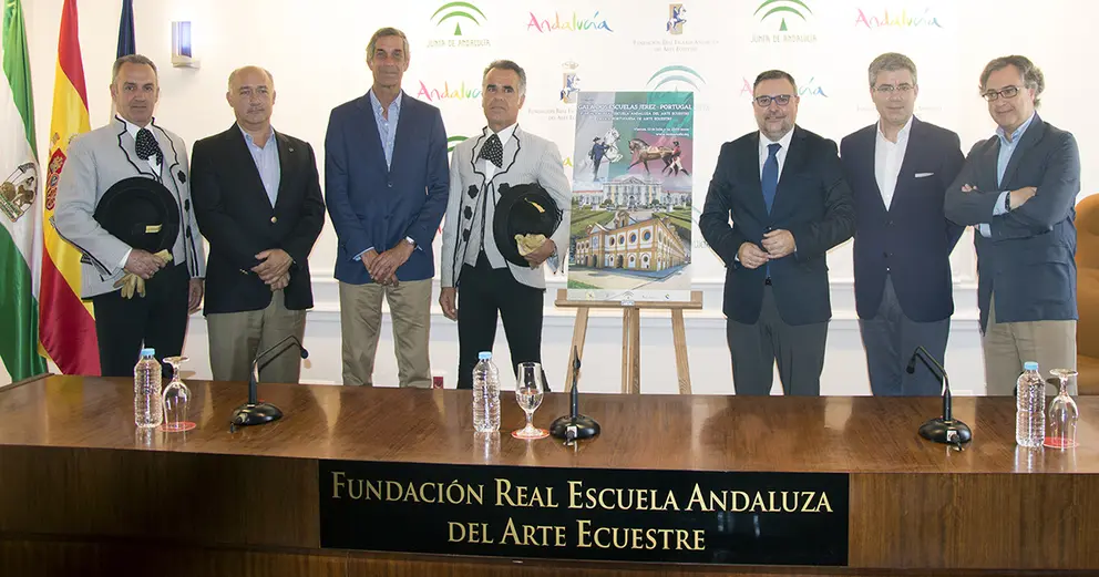 El viceconsejero de Turismo y Deporte, Diego Ramos, presentó hoy esta representación titulada 'Gala dos escuelas Jerez-Portugal' en la sede de la fundación ecuestre andaluza , donde estuvo acompañado por el administrador de Parques de Sintra-Monte da Lua -sociedad que gestiona la Escola Portuguesa de Arte Equestre-, José Lino, y por el director gerente de la REAAE, Juan Carlos Camas.