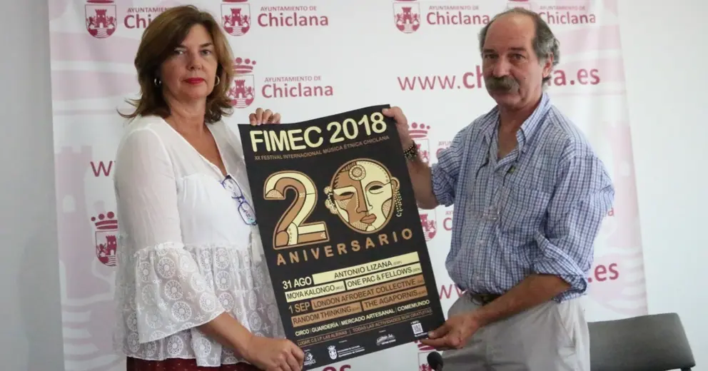 La delegada municipal de Cultura, Pepa Vela, y el representante de la Asociación Amandla, Andrea Morpurgo, han presentado la vigésima edición del Festivial Internacional de Música Étnica de Chiclana (FIMEC), que se celebrará durante las jornadas del 31 de agosto y el 1 de septiembre en las dependencias del CEIP Las Albinas.