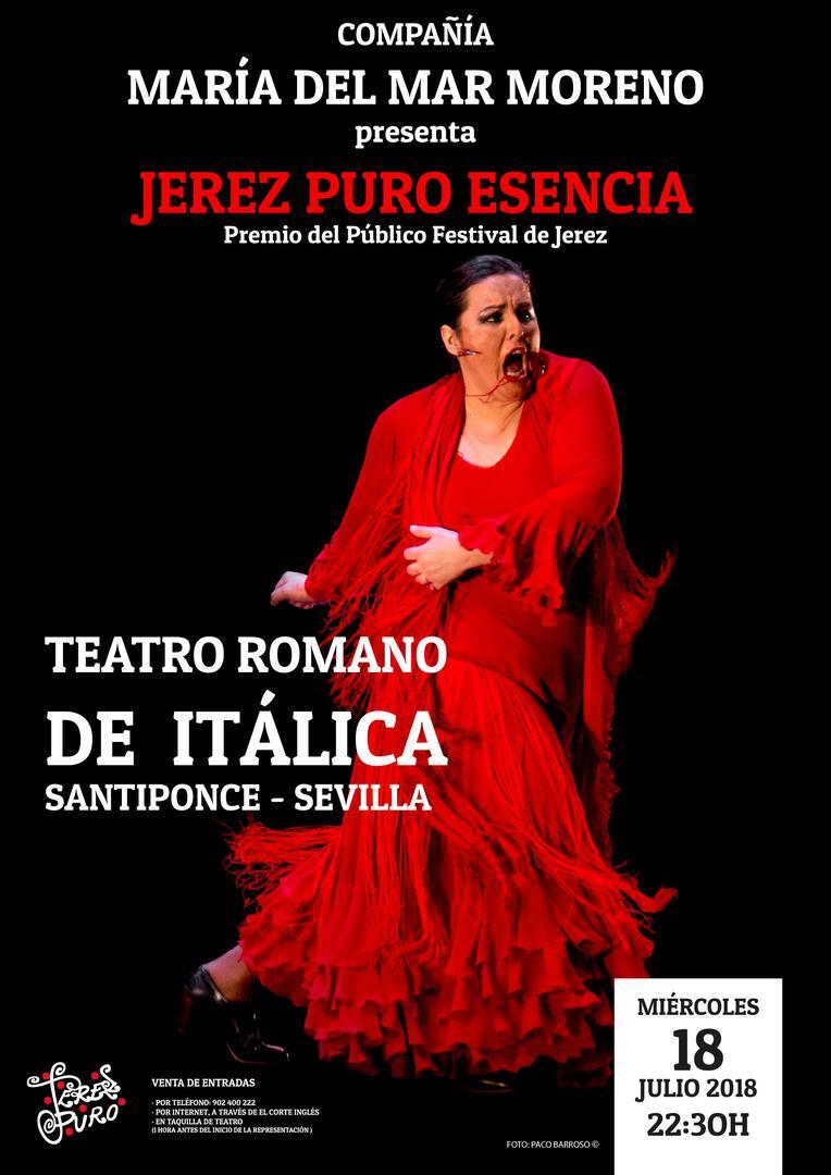 La bailaora jerezana María del Mar Moreno, directora y coreógrafa de su Compañía María del Mar Moreno & Jerez Puro, llevará su emblemático espectáculo “Jerez Puro Esencia” al teatro romano de Itálica el próximo 18 de julio, donde la compañía actuará a partir de las 22.30 horas, dentro del ciclo “Flamenco Patrimonio” programado por la Agencia Andaluza de Instituciones Culturales de la Junta de Andalucía.
