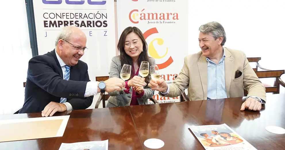La empresaria china ha recibido el diploma acreditativo de manos del presidente de la CEC y la Cámara jerezana, Javier Sánchez Rojas, y el director general del Consejo Regulador de los vinos del Marco de Jerez, César Saldaña.