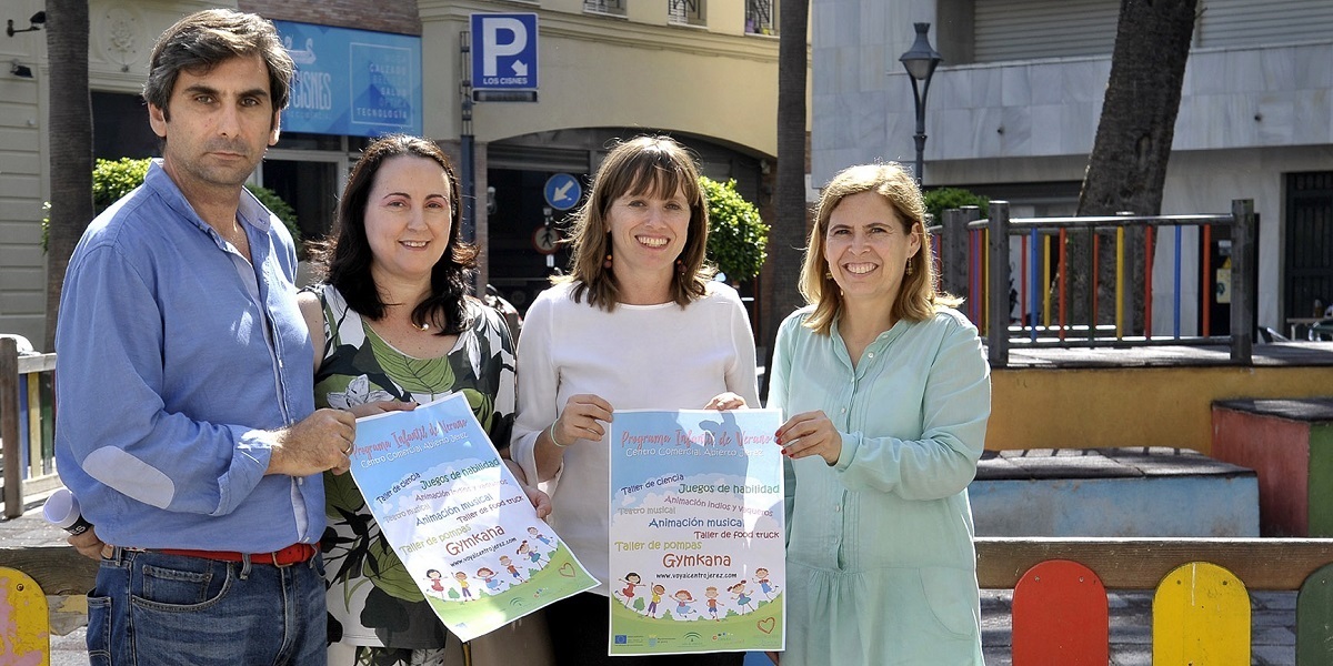 La teniente de alcaldesa de Empleo, Recursos y Deporte, Laura Álvarez, y la presidenta de la Asociación de Comerciantes del Centro (Acoje), Nela García, entre otros miembros de la asociación, han presentado hoy el cartel del Programa Infantil de Verano del Centro Comercial Abierto de Jerez.