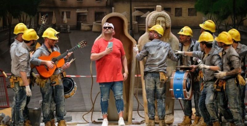 Comentario: Abre la primera sesión de la fase de semifinales del Concurso de Agrupaciones de 2020, la comparsa gaditana, con letra y música de Iván Romero, ¡Quieto todo el mundo! Tercer pase para estos obreros gaditanos que comparten escena con el fenicio que se han encontrado en la excavación. Sale del sarcófago un turista porque el también lo alquila, ya que lo tiene en primera línea de Falla.