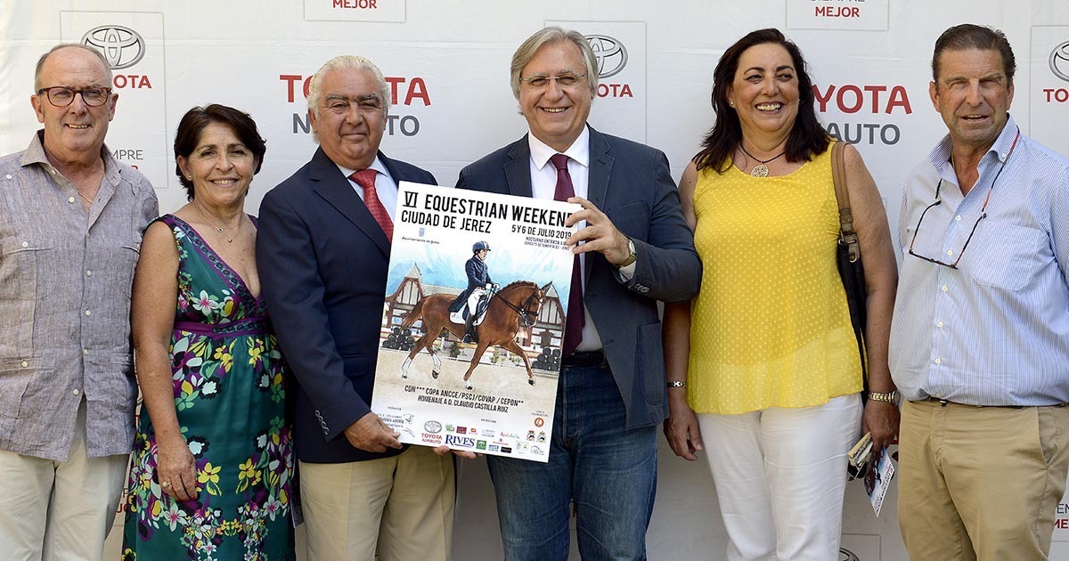 El teniente de alcaldesa de Dinamización Cultural y Patrimonio Histórico, Francisco Camas, junto al presidente del Club Deportivo Ecuestre Los Llanos, Delfín Gómez; el gerente de Toyota Nimauto, José Luis Nimo, y los padres del jinete olímpico, Claudio Castilla, ha presentó el pasado viernes el ‘VI Equestrian Weekend Ciudad de Jerez’, que se celebrará los próximos días 5 y 6 de julio, en el Depósito de Sementales.