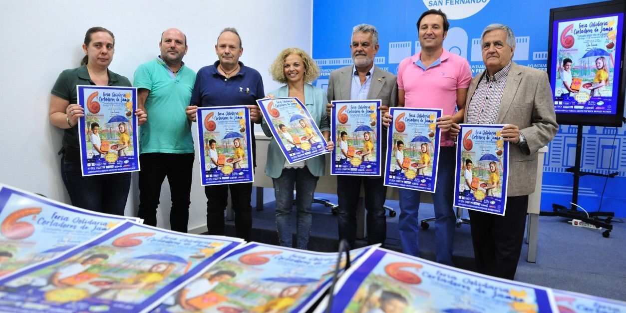 La delegada de Fiestas del Ayuntamiento de San Fernando, Mar Suárez, el presidente de la Asociación Reyes Magos de San Fernando, Juan Fernández Loaiza, y el representante de los cortadores de jamón de La Isla, Pedro Quevedo, han presentado este lunes en rueda de prensa el cartel de la VI edición de la Feria de Cortadores Solidarios de Jamón que se celebrará el próximo domingo 17 de noviembre en la Alameda Moreno de Guerra, como preludio de las fiestas navideñas y a beneficio, una vez más, de la campaña 'Ningún niño sin juguete' que impulsa la asociación isleña.