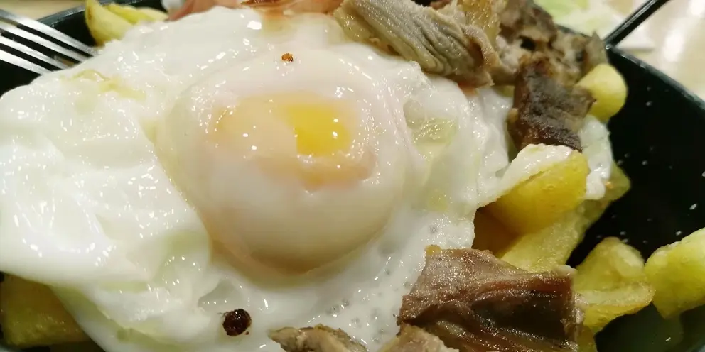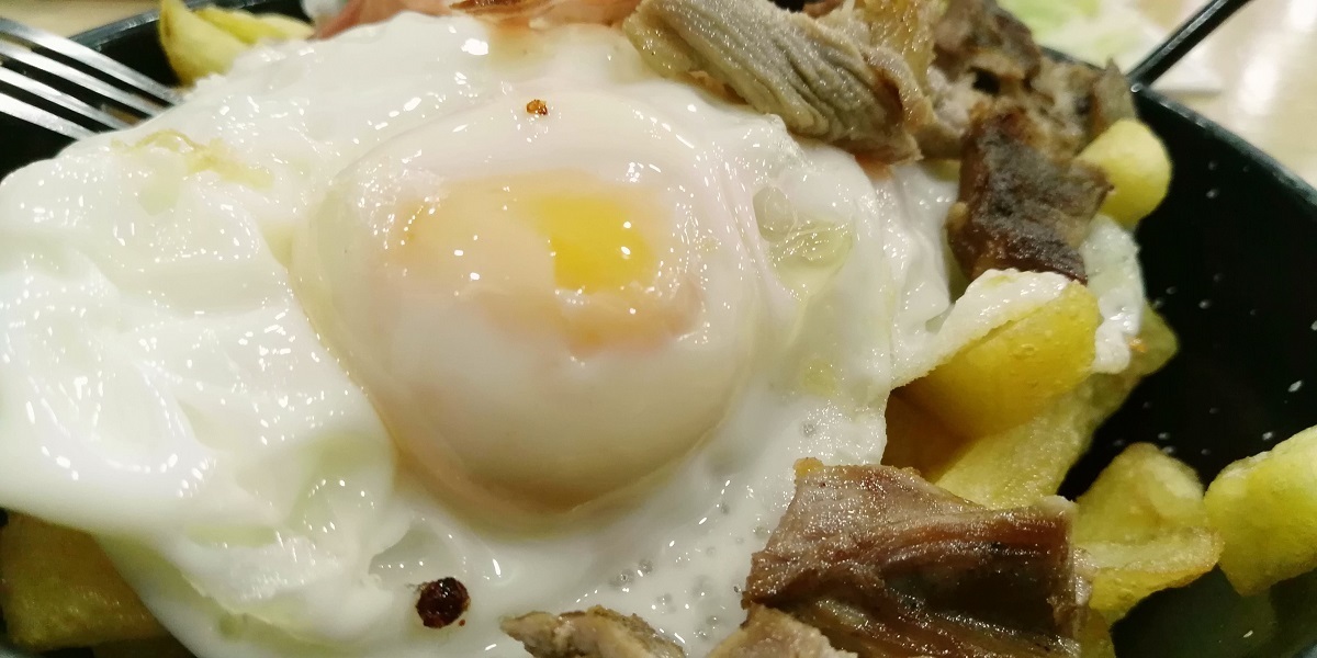 Sí, 3 euros. Sartén de huevo frito con patatas fritas, secreto y salsa brava. Sartén de huevo frito con patatas fritas, secreto y jamón. Sartén de huevo frito con patatas fritas, solomillo y jamón. Sartén de huevo frito con patatas fritas, chistorra y jamón. Sartén de huevo frito con patatas fritas y salchichas. Sartén de huevo frito con patatas fritas, queso de cabra y cebolla caramelizada. Sartén de huevo frito con patatas fritas, queso de cabra y beicon. ¿Se puede pedir más?