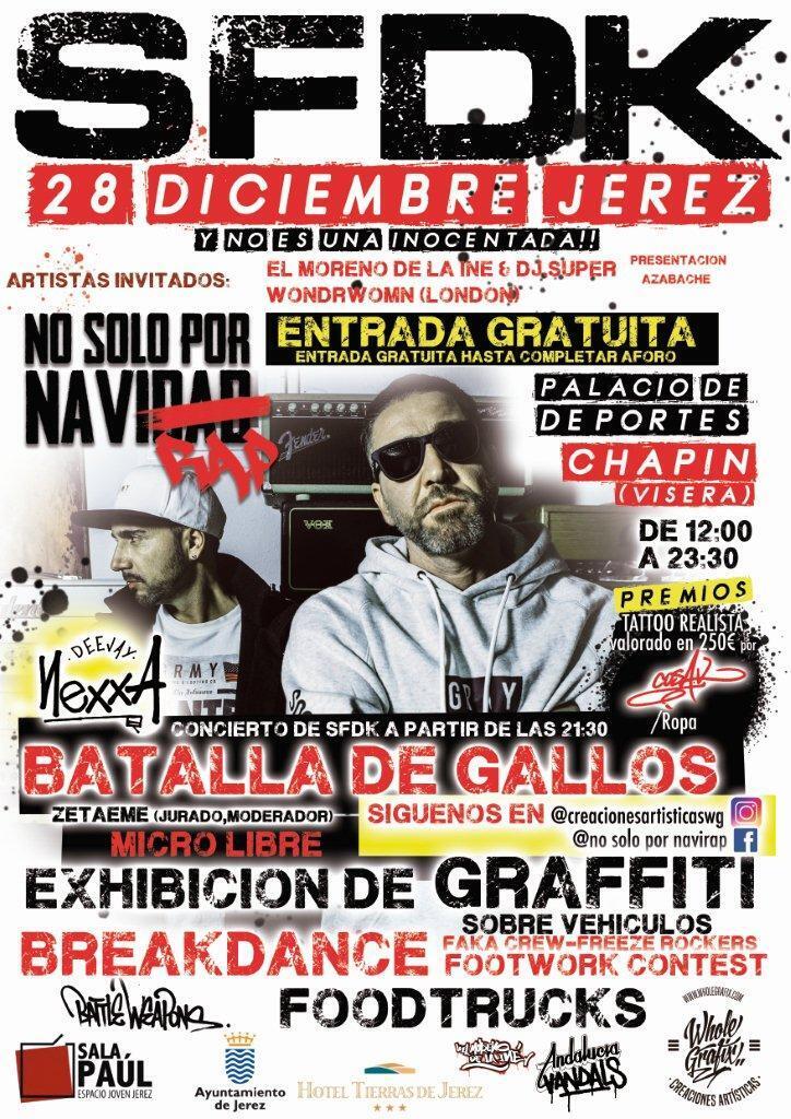 Las actividades comenzarán a partir de las 12 horas, exhibición de graffitis y Break, de 18 a 20 horas tendrá lugar la batalla de gallos. A las 20 horas actuará como grupo invitado El Moreno de La Iné y WondrWmn, artista que llega directamente desde Londres. A partir de las 21.30 horas, el concierto de SFDK se presenta como el plato fuerte de una jornada cultural muy atractiva y novedosa.